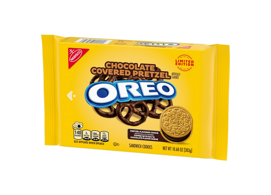 Biscoitos OREO recheados com creme sabor chocolate, entre duas camadas crocantes de biscoito sabor pretzel, finalizados com toque de sal. Uma combinação perfeita de doce e salgado, inspirada no clássico chocolate com pretzel.